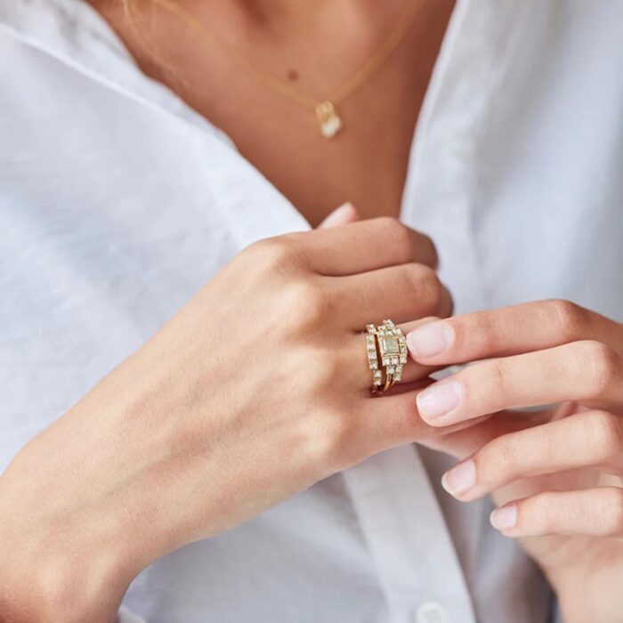 Som en signaturdetalje er ringen afsluttet med en lille Ro signatur-diamant på 0,003 ct tw.vs, diskret placeret i ringskinnen – en fin reference til brandets håndværk og identitet.